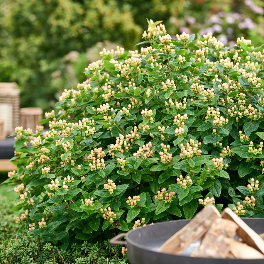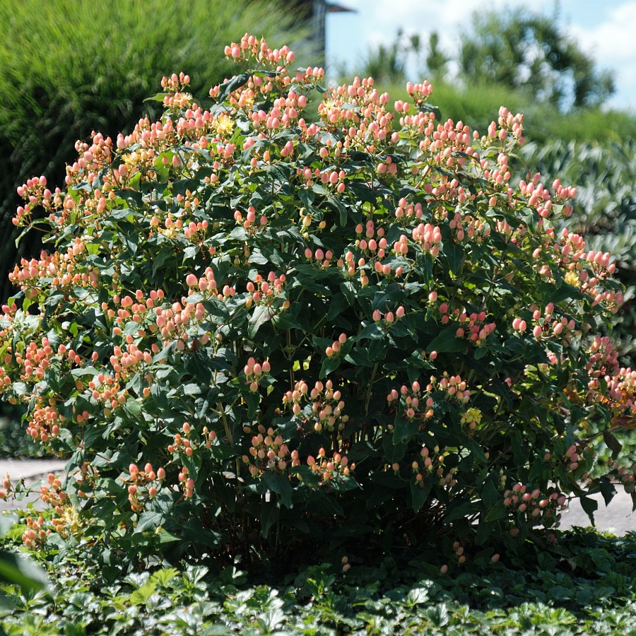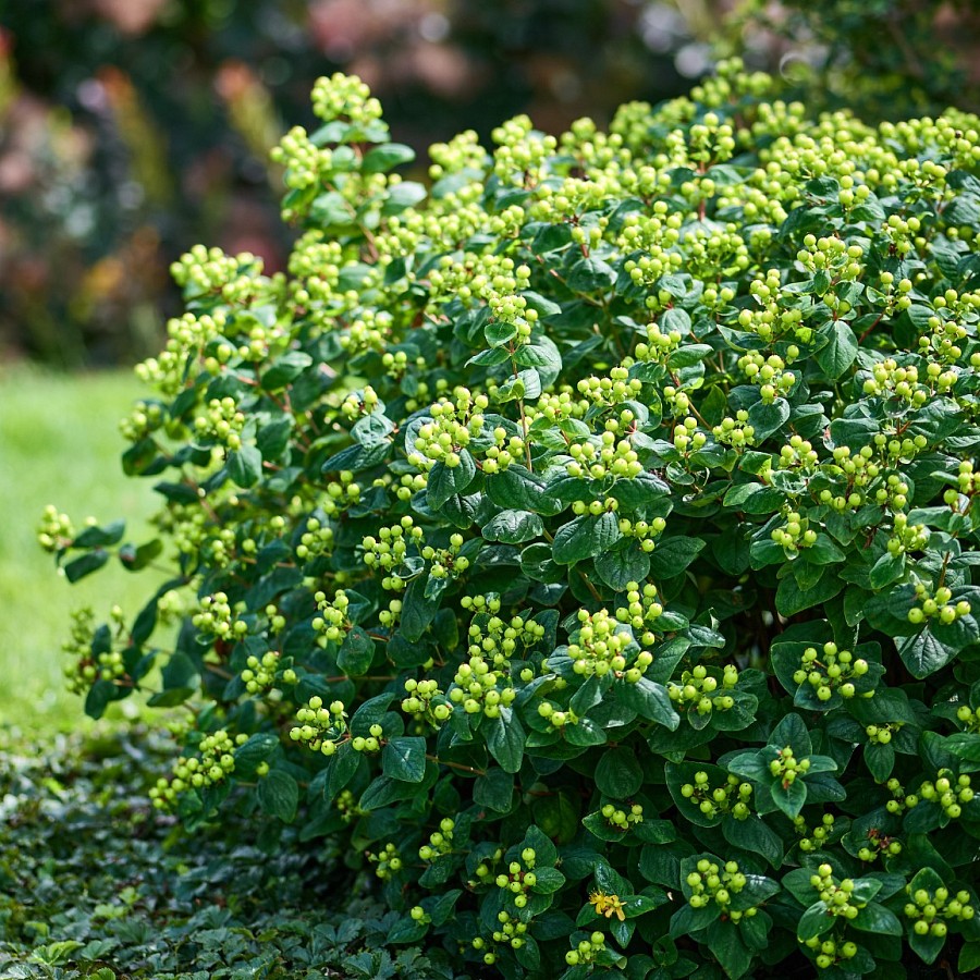 Compacte struik met groen-witte bloemen, die doorkleuren naar donkerroze en rood.